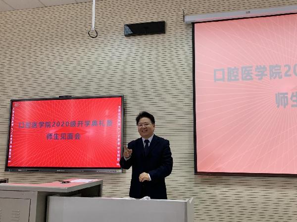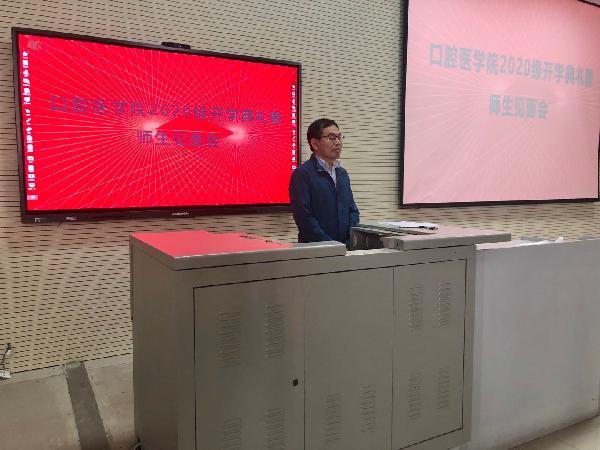 严喜章院长代表学院全体师生向2020级新同学的到来表示热烈的欢迎。回顾了学院发展取得的成绩,特别是今年已获得的荣誉和学术成果,以此激发同学们对口腔医学专业的学习热情。在讲话中提到了2020年网络上最火的主题词“最美逆行者”和“乘风破浪”,引起了同学们的共鸣。疫情下的“最美逆行者”彰显了医者的担当和使命,希望同学们学习榜样、坚定学医初心!;“乘风破浪”是属于2020级新生在即将开始的学医生涯中的关键词,希望同学们碰到困难不退缩,遇到挫折不气馁,劈波斩浪,勇敢前行。祝愿各位新生能够“立业成家”,不但要成为一名口腔好医生,还要立志成为一名医学家,成为一名学术造诣深