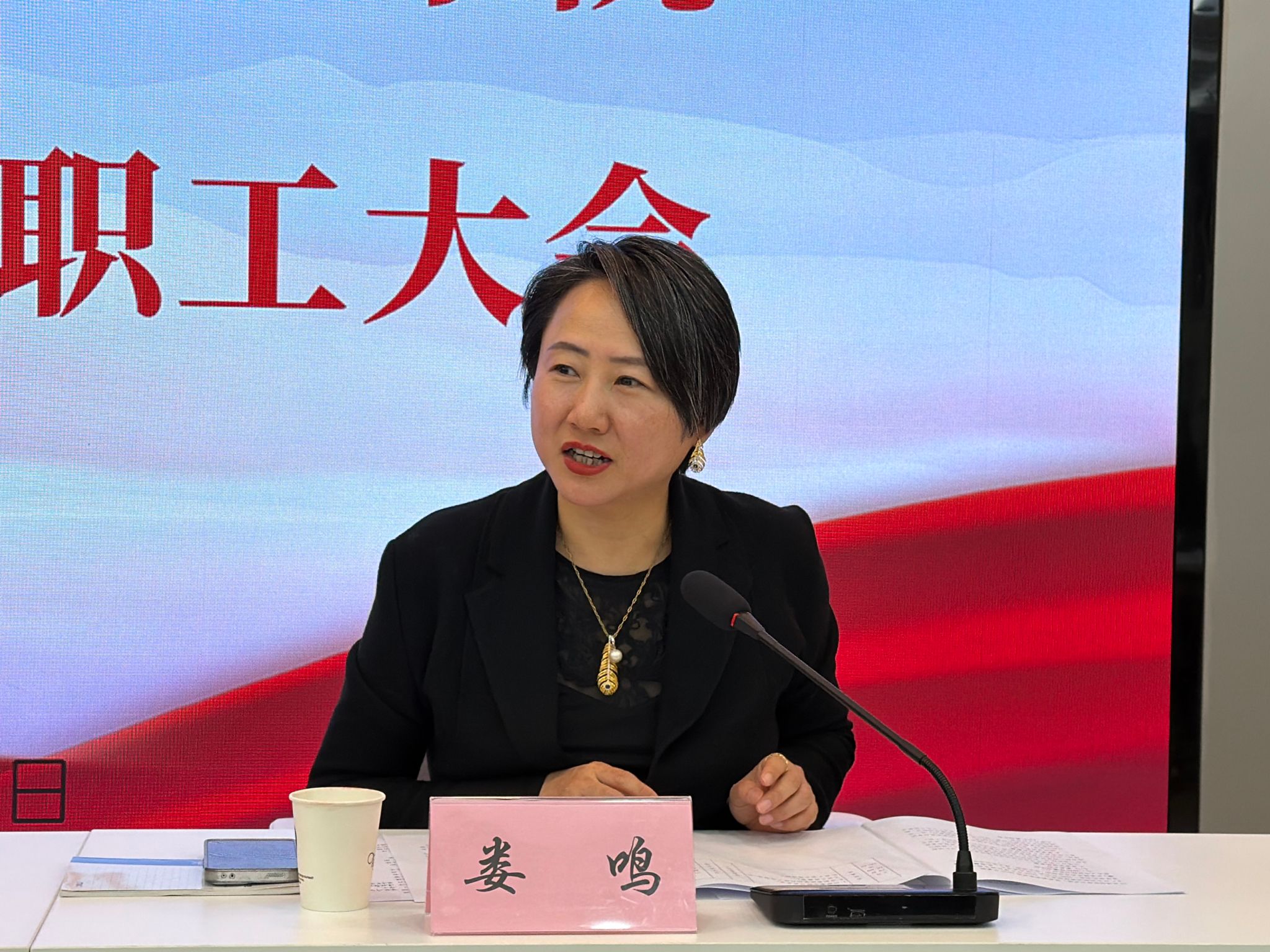党总支书记娄鸣总结发言。她指出教职工大会给大家提供了畅所欲言的平台,也进一步加强了院务公开。学院目前面临口腔医学专业认证的挑战,我们全体教职工都要团结协作,共同努力并能顺利通过专业认证的考验。希望全体教职工能够牢记立德树人根本任务,以饱满的热情和务实的作风投身2026年的工作,谱写学院发展的新篇章。(文/图 刘璞 审核/娄鸣)
