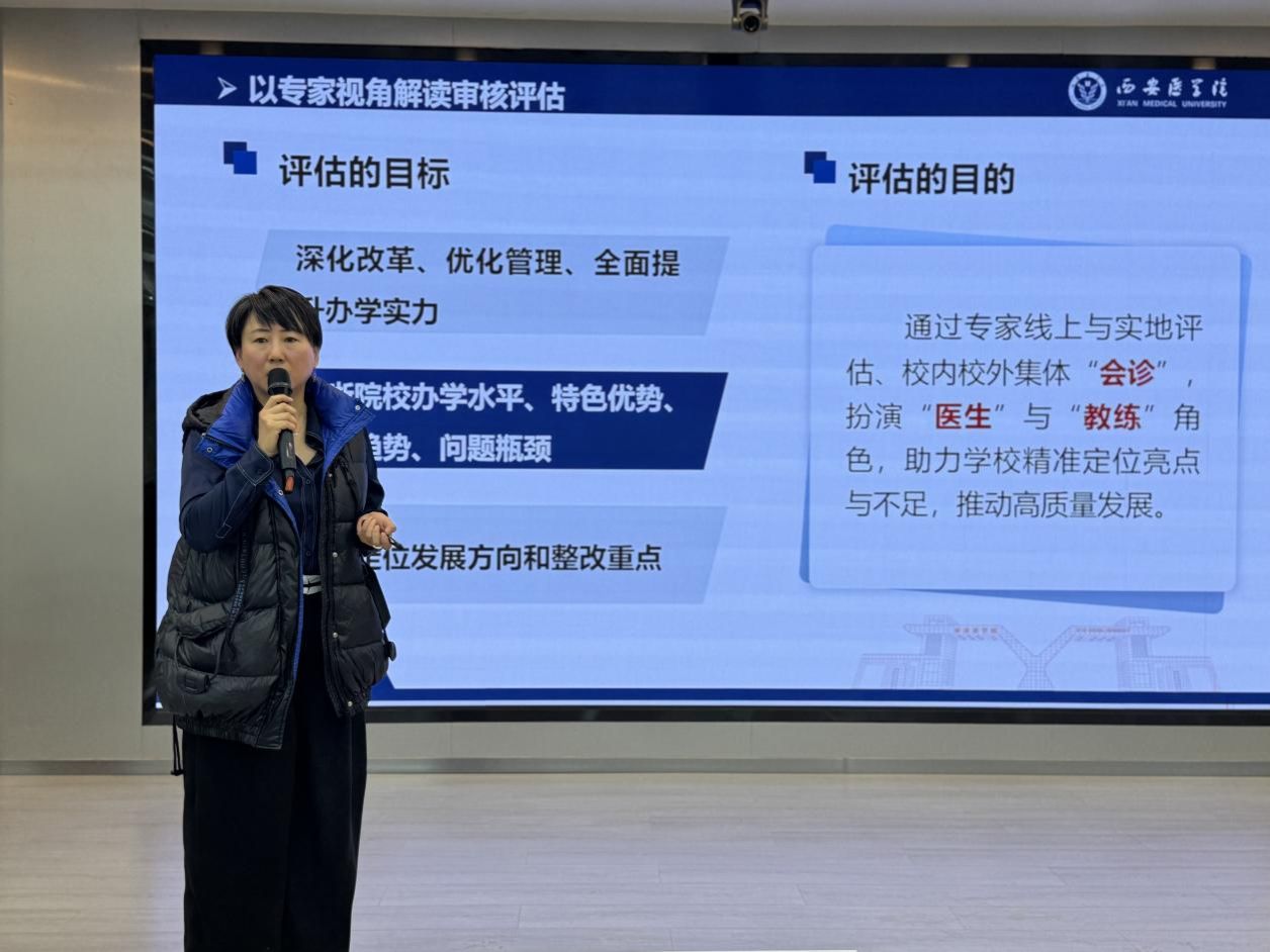 娄鸣结合自身参加学校多次审核评估的经历,传达了巩守平校长《凝心聚力 以崭新的姿态做好审核评估工作》的报告。阐释了新一轮审核评估的基本要求、把握与专家相处的态度、如何判断真亮点和真问题、如何理解学生中心、产出导向、持续改进理念等问题。