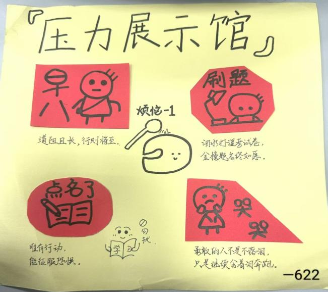 同学们以宿舍为小组,结合曾经的压力或挫折故事,共同构思创意项目,利用各种废旧材料和手工制作工具进行制作,将压力与挫折的元素融入到作品设计中。在活动中,各小组代表介绍作品的创意和寓意,分享和作品有关的故事,描述当时的情境、感受以及后来积极的应对方式。